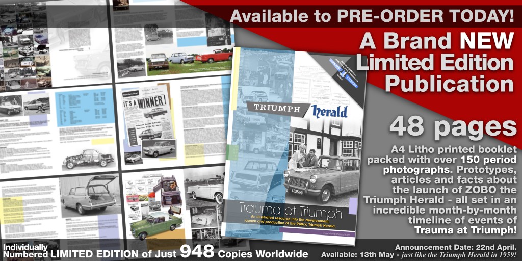 Just like back in 1959, the Triumph Herald was first available in European Showrooms May 13th, this new publication will too be available May 13th. It is available to pre-order today!