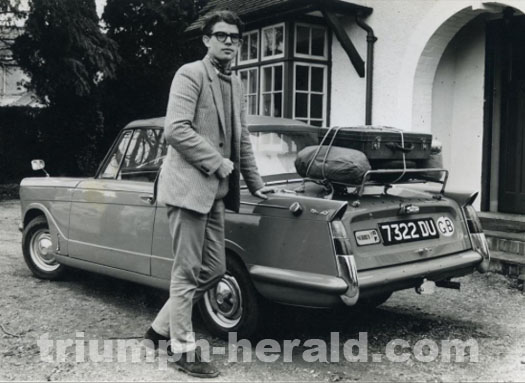 “Next stop Sri Lanka. Guy Cooper and his Triumph Herald Convertible in England shortly before embarking on an epic trans European and Asian adventure driving to what was then called Ceylon. Both look more kitted out for a weekend in the country.”