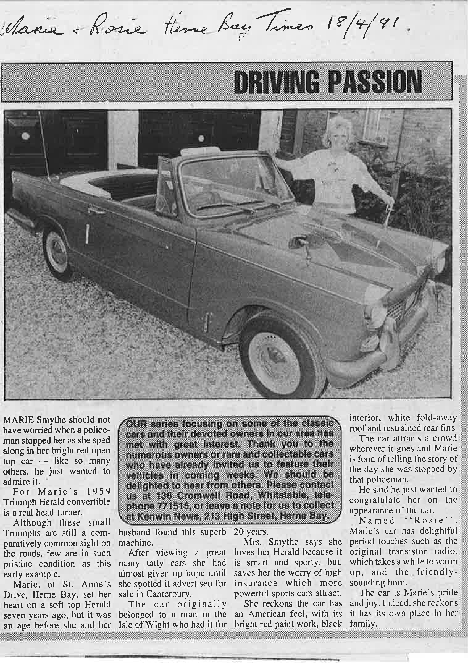 MARIE Smythe should not have worried when a police-man stopped her as she sped along in her bright red open top car — like so many others, he just wanted to admire it. For Marie’s 1959 Triumph Herald convertible is a real head-turner. Although these small Triumphs are still a com-paratively common sight on the roads. few are in such pristine condition as this early example. Marie, of St. Anne’s Drive, Herne Bay, set her heart on a soft top Herald seven years ago, but it was an age before she and her husband found this superb machine. After viewing a great many tatty cars she had almost given up hope until she spotted it advertised for sale in Canterbury.The car originally belonged to a man in the Isle of Wight who had it for 20 years. Mrs. Smythe says she loves her Herald because it is smart and sporty, but saves her the worry of high insurance which more powerful sports cars attract. She reckons the car has an American feel, with its bright red paint work, black interior, white fold-away roof and restrained rear fins. The car attracts a crowd wherever it goes and Marie is fond of telling the story of the day she was stopped by that policeman. He said he just wanted to congratulate her on the appearance of the car. Named “Rosie”. Marie’s car has delightful period touches such as the original transistor radio, which takes a while to warm to up and the friendly-sounding horn. The car is Marie’s pride and joy. Indeed, she reckons it has its own place in her family.