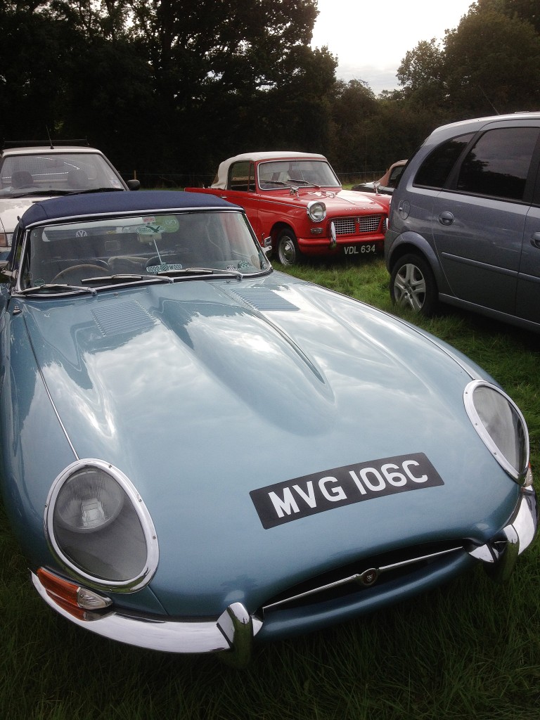 A pleasant drive to the airfield (a bit of a traffic jam en route thanks to a village ‘garage’ sale immediately before Sywell) but it didn’t damped spirits. We were dressed in a sixties smart gear and were even told we looked ‘fabulous’ as we walked our way in. We were too late to get ‘Classic Parking’ despite a huge area still left where all the classic could have parked together but, it seems we were in good company in the ‘normal’ car park with this lovely E-type Jaguar. Just in front was a DB5 Aston Martin, a Triumph TR3 (also in Signal Red and probably going through the Canley factory around the same time!)
