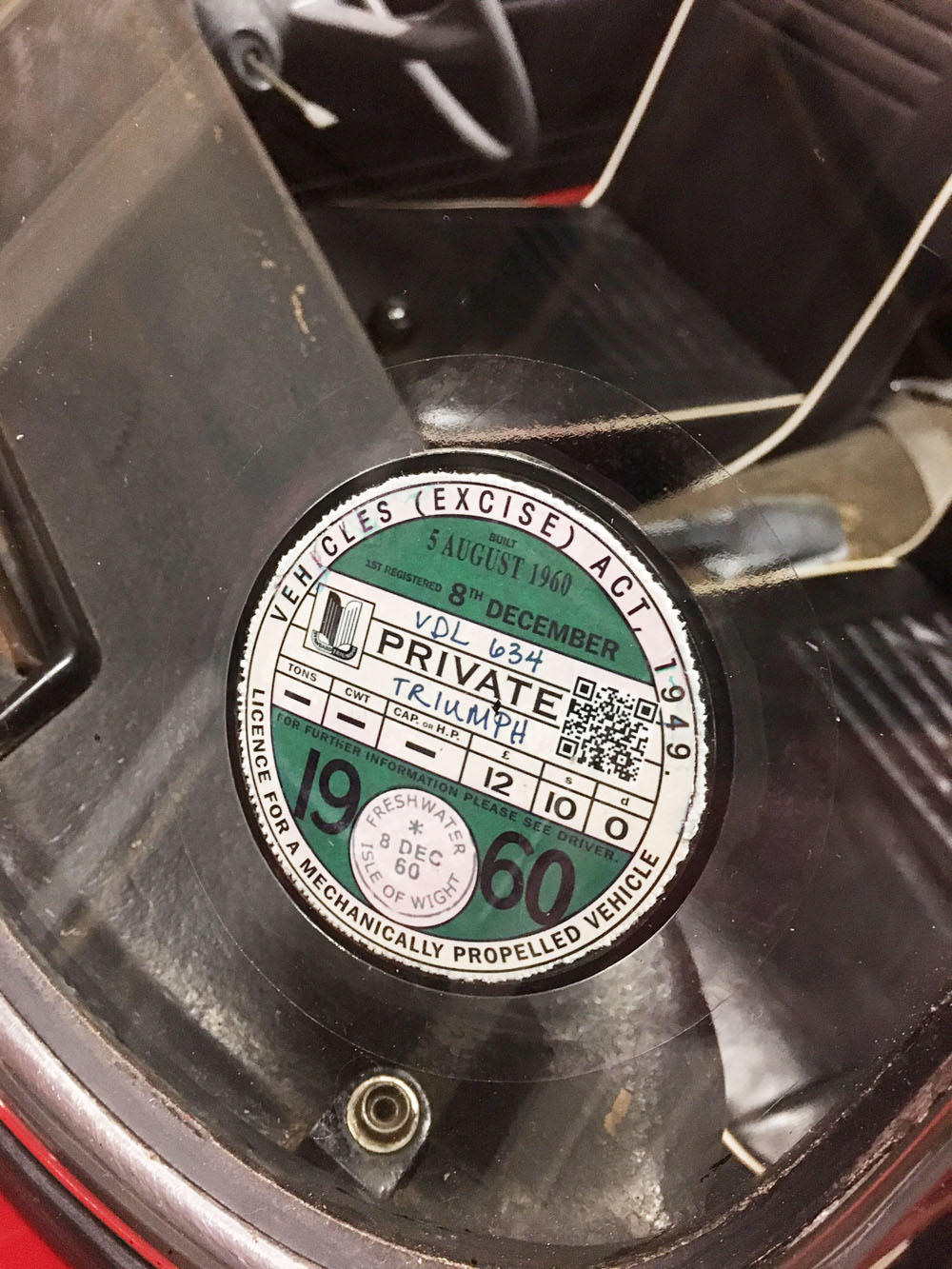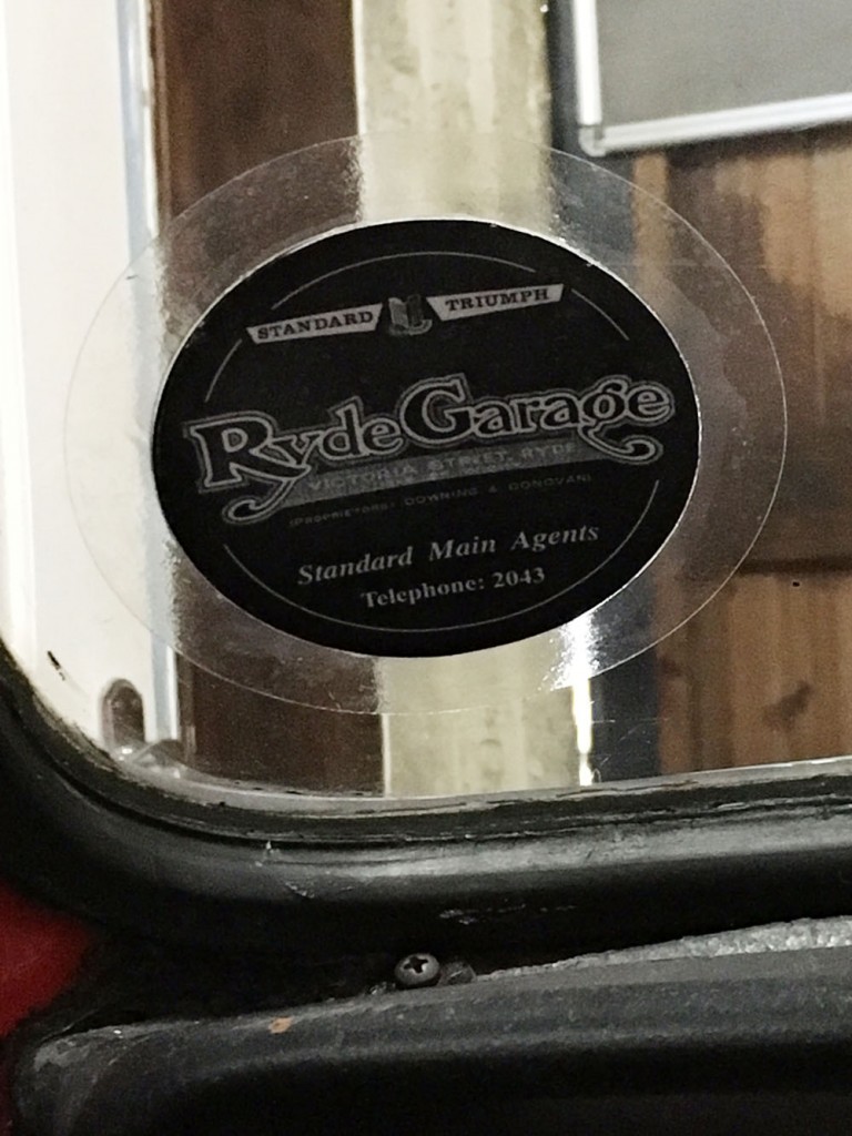 The inside of the tax disc holder had always been a bit of an annoyance – a modern blue disc advertising some brake company. I do have an original Barnacle metal tax disc holder but the suction rubber no longer seems to stick resulting in the disc popping off at unfortunate times – so we have also reproduced the inside of a tax disc holder too to depict the original garage – Ryde Garage – where the car came from.