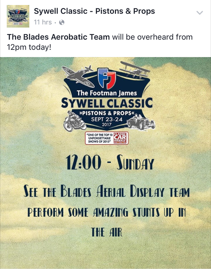 The posts on Facebook during the show numbered just 9 on Saturday (not one showing the evening) and 6 on the Sunday. Every post was a Sywell Pistons and Props logo with a timing for an event – Blades in the sky, for instance. These did get reactions from people with everyone commenting “how much for tickets?” These comments were left unanswered for hours (Saturday comments were not answered until the show had finished) and eventually each “how much?” comment was answered but not by the price for the tickets – but “look on the website” to which most people read as “look on the website for prices you f**king idiot!”
