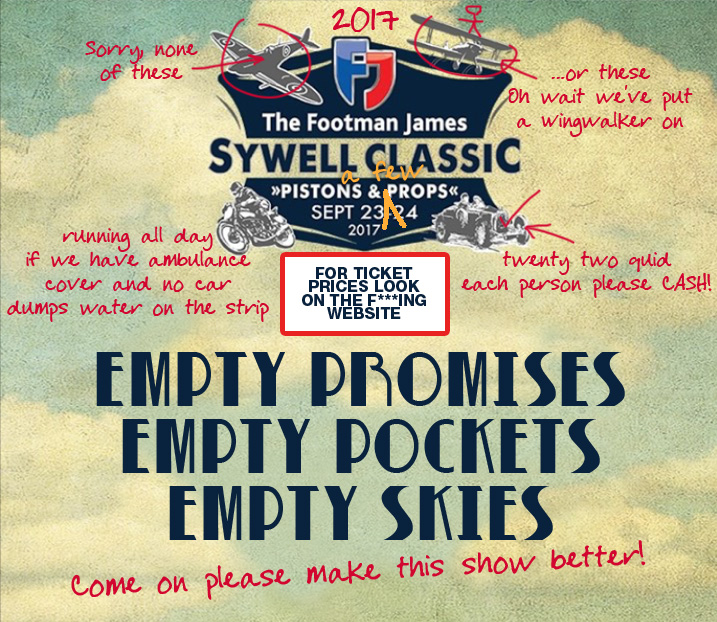 For the fourth year in a row we have taken the Herald to Sywell Pistons and Props – a show that promises so much and delivers so little. I always look forward to the show, thinking the little problems will be resolved but leave each year thinking it’s such a shame. It could be an excellent show, it should be an excellent show. It isn’t. Consequently it’s time to write a proper review on one aspect of the show, which I feel is inaccurate, lazy and very, very poor; the marketing of the show.